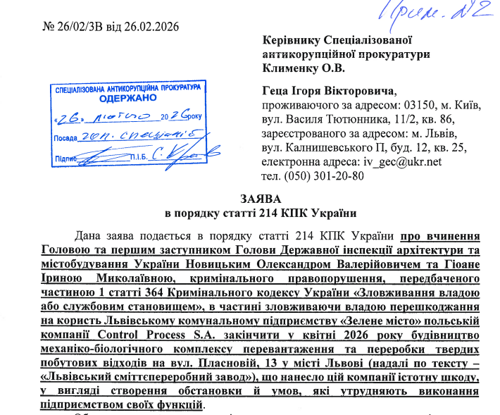 26 лютого цього року представник Національної спілки архітекторів України Ігор Гец подав на ім’я керівника Спеціалізованої антикорупційної прокуратури Олександра Клименка заяву про необхідність відкрити кримінальне провадження за ознаками злочину, пов’язаного з будівництвом Львівського сміттєпереробного заводу. За словами заявника, до злочину причетні голова та перший заступник голови Державної інспекції архітектури та містобудування України Олександр Новицький та Ірина Гіоане.