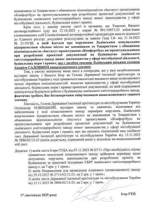 У своєму відповідному листі, адресованому голові Державної інспекції архітектури та містобудування України Олександру Новицькому, Ігор Гец повідомив, що незаконна зміна проєктної документації на будівництво Львівського сміттєпереробного заводу за чергами є засобом вчинення Львівським міським головою Андрієм можливого злочину, про який йдеться мова.