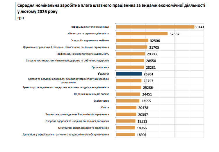Найбільш оплачуваними у лютому були працівники підприємств та організацій інформації та комунікацій (80141 грн), фінансової та страхової діяльності (52657 грн), операцій з нерухомим майном (32506 грн), державного управління й оборони, обов’язкового соціального страхування (31705 грн).