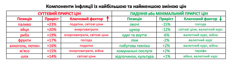 Динаміка інфляції залишається вкрай волатильною. Зараз розмах річної зміни цін становить майже 40 відс. пунктів: від -15% на овочі до +23% на паливо, що говорить про ситуативність драйверів інфляції, а не про єдиний інфляційний тренд. Понад 70% інфляції сформовано позиціями продовольчої групи.