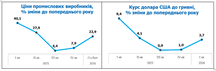 Інфляція перебуває під домінантним тиском зростання цін промислових виробників (+23% в середньому за 2 місяці 2026 р. проти минулого року, переважно за рахунок росту цін на енергоносії: +39%). Інші фактори прискорення інфляції - підвищення акцизів на тютюн та пальне, ріст світових цін (зокрема на олію та енергоносії), фіскальний дефіцит, а також погодні умови.