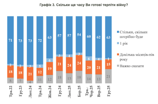 63% українців готові терпіти війну стільки, скільки буде необхідно (у вересні було 62%);
