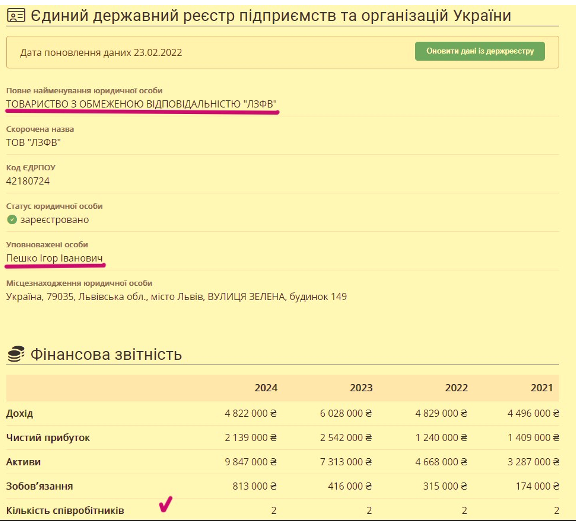 За 2025 рік фінансової звітності знайти не вдалось. Водночас виникає питання, на підставі яких фінансових оборудок щороку в ТзДВ «ЛЗФВ» так стрімко зростають активи: 2021 рік – 3,287,000 грн, 2022 рік – 4,688,000 грн, 2023 рік – 7,313,000 грн, 2024 рік – 9,847,000 грн. Припускаємо, що на фінансовій операції передання майна у найм такі статки заробити неправдоподібно.
