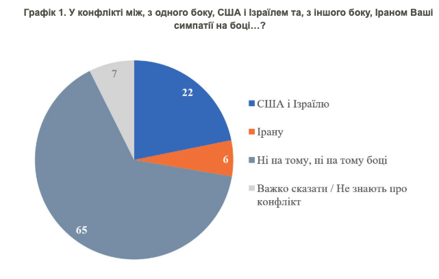 Згідно з дослідженням, 65% українців заявили, що не підтримують жодну зі сторін. Водночас 22% висловили симпатії до США та Ізраїлю, лише 7% — до Ірану, ще 7% не змогли визначитися або не обізнані з ситуацією.