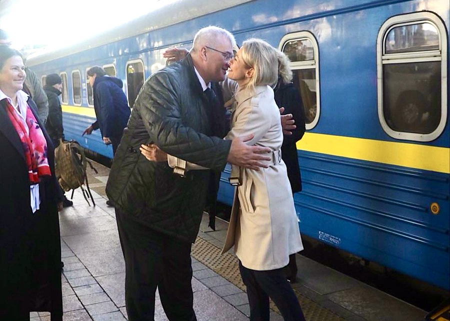 На опублікованому нею в мережі Х фото її на київському залізничному вокзалі зустрічає міністр закордонних справ Андрій Сибіга.