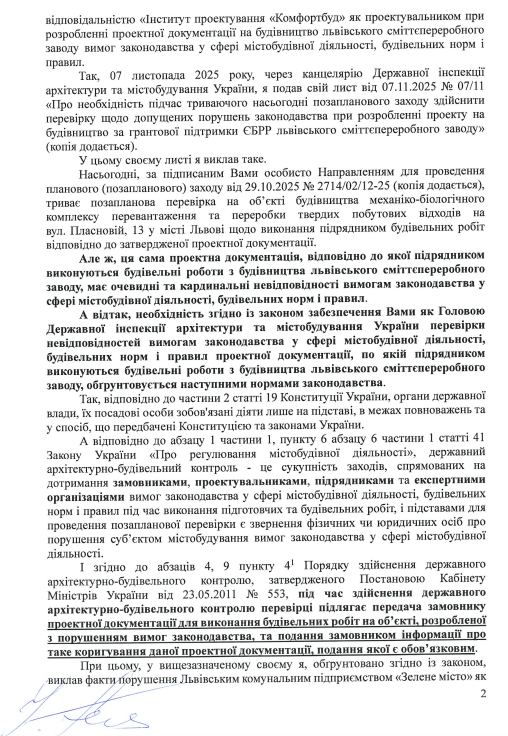 Головний спеціаліст Національної спілки архітекторів України Ігор Гец звернувся до Спеціалізованої антикорупційної прокуратури листом (від 17.11.2025 № 17/11), у якому надав докази співучасті голови Державної інспекції архітектури та містобудування України Олександра Новицького у злочині, який, можливо, скоїв міський голова Львова Андрій Садовий. Йдеться про злочин, передбачений частиною 2 статті 15 та частиною 2 статті 364 Кримінального кодексу України.