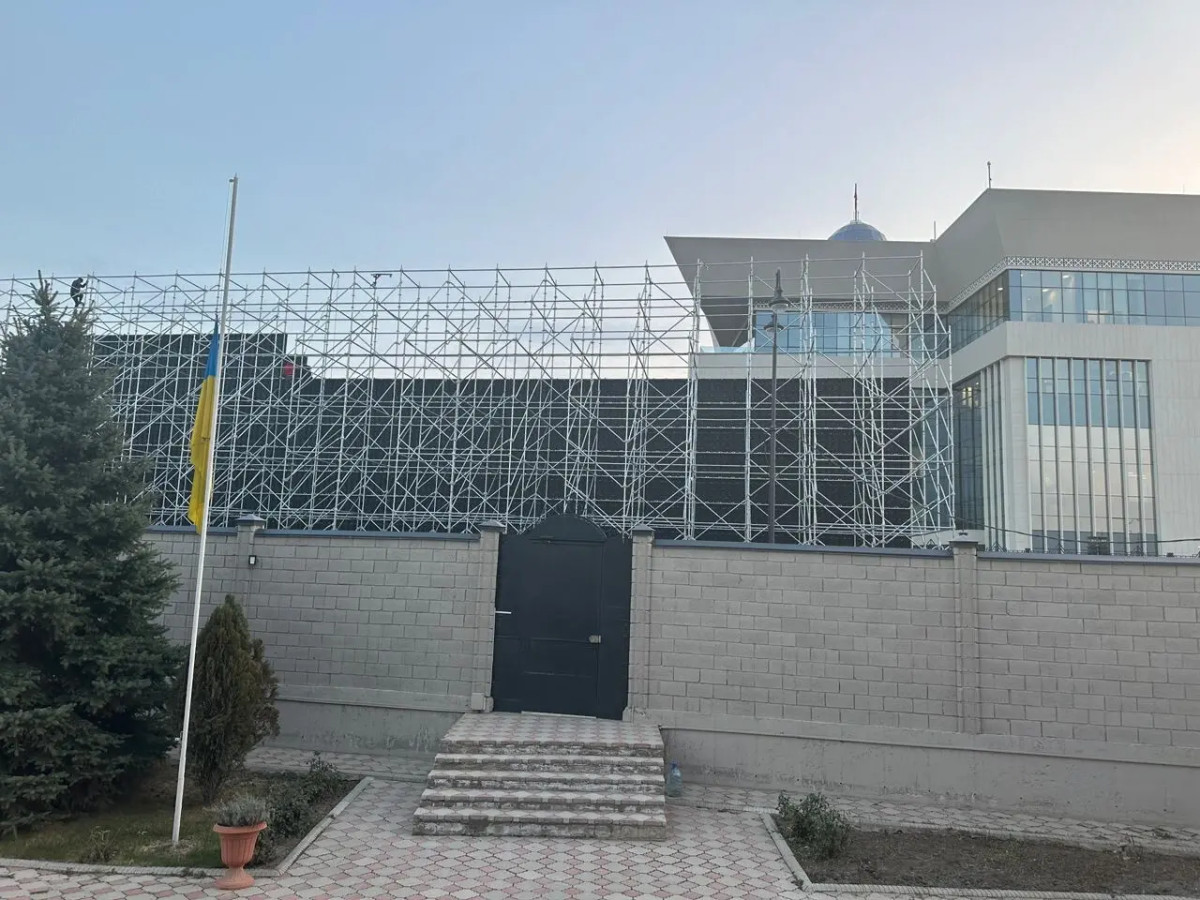 «Знайомий журналіст побував поряд із резиденцією та помітив цікаву деталь – зараз біля резиденції саме з боку посольства зводять величезний екран. Конструкція має закрити будівлю посольства та жовто-синій прапор», - зазначив Пирлік та додав фото.