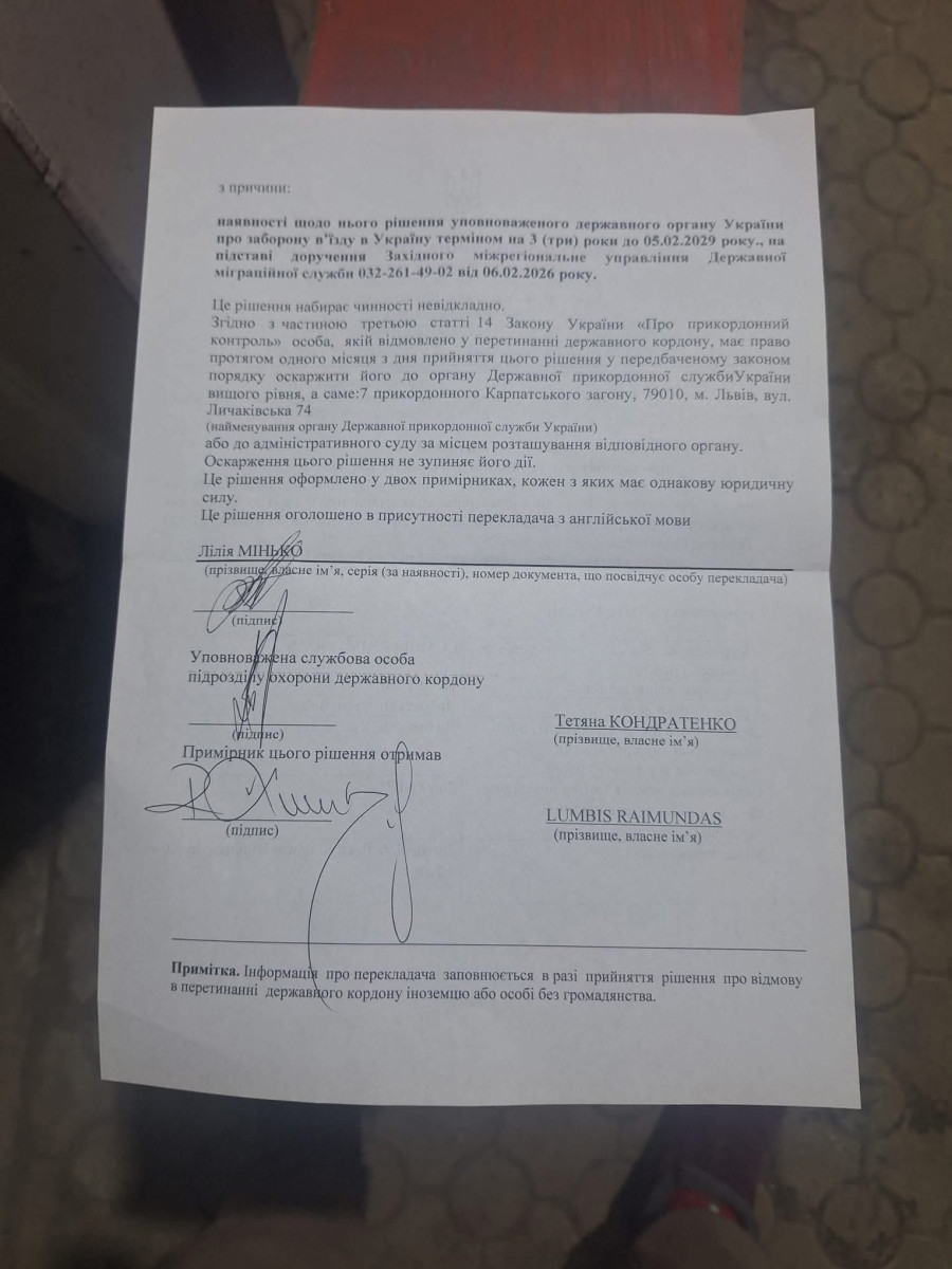 Але на кордоні Раймондаса не пропустили в Україну і винесли рішення про заборону на в'їзд в Україну на три роки!