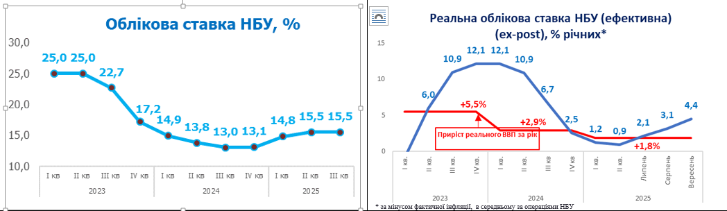 23 жовтня Правління НБУ прийняло рішення зберегти облікову ставку на рівні 15,5% річних незважаючи на появу тренду на зниження інфляції. Параметри інших інструментів НБУ також залишилися незмінними: ставка 3-місячних депозитних сертифікатів - 19% річних, ставка депозитних сертифікатів овернайт - 15,5% річних, ставка кредитів рефінансування - 19,5% річних. Тепер реальна ефективна ставка НБУ (за мінусом інфляції) складає 4,4% річних при темпах росту реального ВВП лише +1,8% (за 9 міс. 2025). Жорсткий фарватер монетарної політики перманентно зберігається в країні останні 8 років.