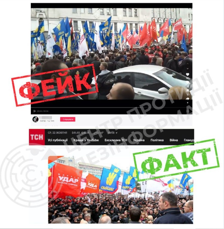У центрі пояснили, що для створення таких фейків використовують реальні записи акцій протесту, що відбувалися в Україні в різні роки, деякі навіть понад десять років тому.