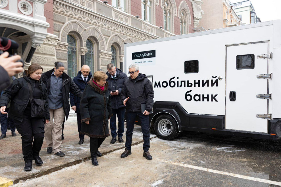 На світлині: очільниця МВФ Крісталіна Георгієва під час візиту до Києва біля будівлі НБУ