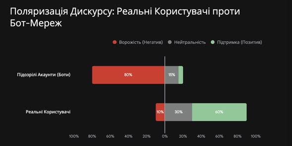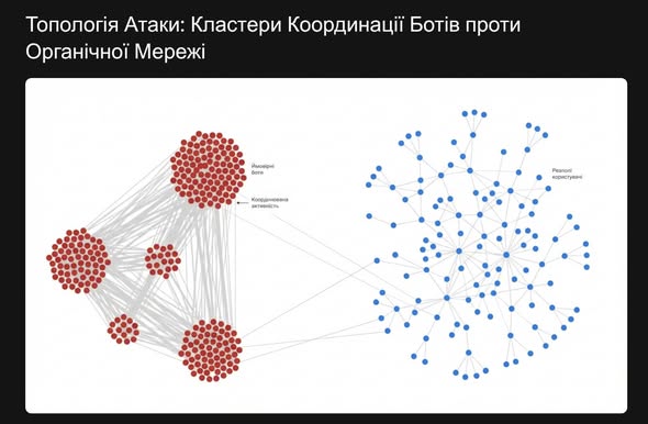 Аналіз показує, що 80% екстремального негативу генерують акаунти з ознаками автоматизації (боти). На другому графіку чітко видно, що «хейтери» (червоні вузли) – це штучно згуртовані групи, які створюють ілюзію масовості, тоді як реальні люди (сині вузли) діють органічно та децентралізовано.