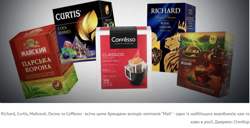 Компанія "Май" — один із найбільших виробників чаю та кави на території росії. Під її брендами продаються Richard, Curtis, Майский, Лисма та Coffesso. Засновник — Ігор Лісіненко, уродженець України, який побудував бізнес у Москві та був депутатом держдуми від "єдиної росії". Його компанія отримувала нагороди від держави, а сам Лісіненко став співзасновником організації "ділова росія".