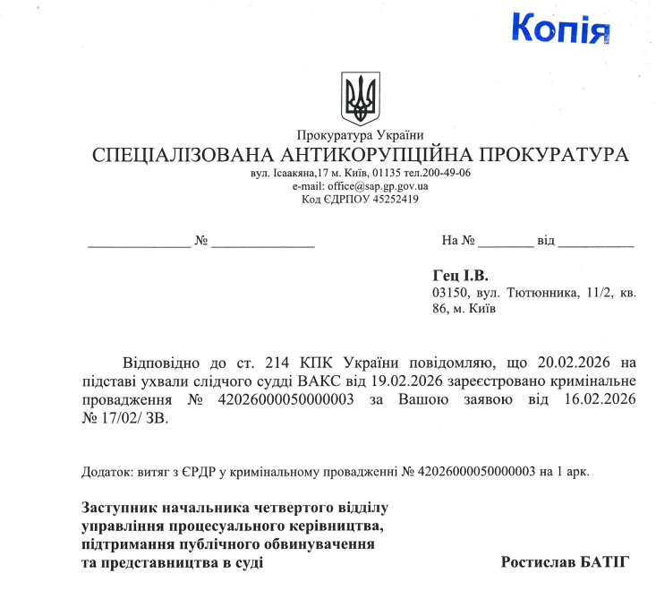 Напередодні Вищий антикорупційний суд України ухвалою від 19 лютого 2026 року у справі № 991/1480/26 зобов’язав керівника Спеціалізована антикорупційна прокуратура Олександра Клименка внести відомості до ЄРДР та розпочати кримінальне провадження щодо директора ЛКП «Зелене місто» Олександра Єгорова.
