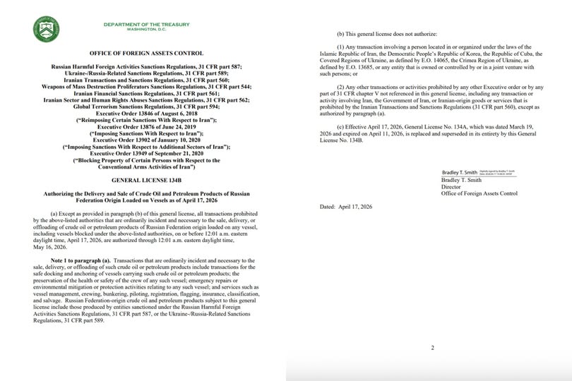 В опублікованому американським мінфіном документі йдеться про продовження винятку, який запровадили місяць тому на тлі війни з Іраном. Тоді іноземним країнам дозволили купувати російську нафту, яка вже була завантажена на танкери та перебувала в морі. Термін дії цього дозволу закінчився 11 квітня.