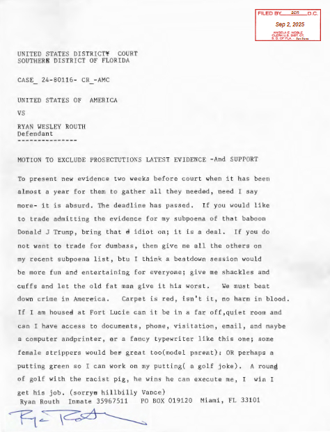 Про серйозний «заворот мізків» у Раяна Раута свідчить його клопотання, яке він подав 2 вересня 2025 року в окружному суді Флориди.