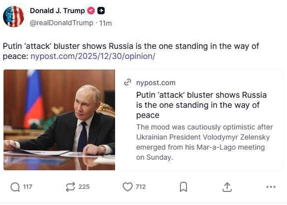 Президент США Дональд Трамп зробив репост у своїй соцмережі Truth Social публікації, де йдеться про те, що саме Росія блокує мирний процес. Він поширив заголовок матеріалу New York Post, у якому зазначається, що різкі заяви Володимира Путіна про нібито «українські напади» свідчать про небажання Москви рухатися до миру.