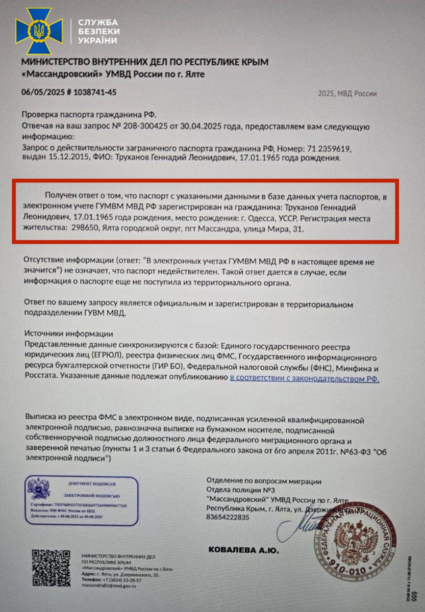 Так, згідно із наявними даними, 15 грудня 2015 року, уже після початку агресії проти України і тимчасової окупації Криму, а також частини Донецької та Луганської областей, Геннадій Леонідович Труханов отримав закордонний паспорт країни-окупанта. Він виданий строком на 10 років і наразі є чинним документом.