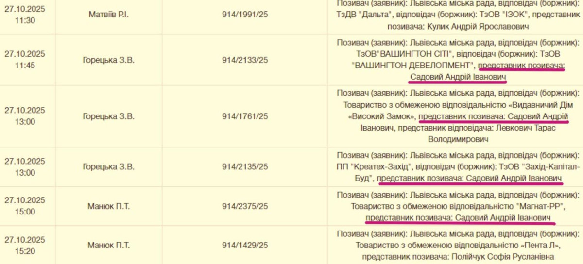 Тільки за один день, 27 жовтня 2025 року, адміністрація міського голови позивається шість разів, а сам Андрій Садовий – чотири рази перебуває у почесному статусі представника позивача. Він судиться навіть із виданням «Високий Замок», яке нібито лояльно ставилось до міського голови.
